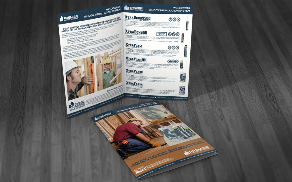 MITO Studios did the graphic design & printing of an informative brochure about the WindowPak product family from Premier Building Solutions. This was another facet of our rebranding project for Premier, which included the design and printing of technical data sheets (TDS), product line flyers, product package labels, eco-friendly Green Advantage program flyers, and more. This collateral highlights several different products and options, so we opted for a bi-fold brochure in full color.